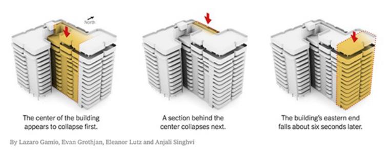《纽约时报》报道曾指出,该大楼垮塌时呈现的“分段式垮塌”现象或由多种原因导致——包括设计缺陷、建楼时(40年前)的建筑规范下所允许的结构不够牢固等。不过,如若没有一些关键性的故障点,这种大面积的垮塌是“极不可能发生的”。
